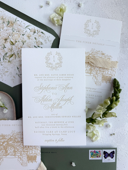 Customize this suite with your choice of enclosure cards, envelope color, envelope liner artwork, print process, ink color, and added embellishments like ribbon, bellybands, and wax seals.